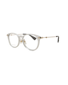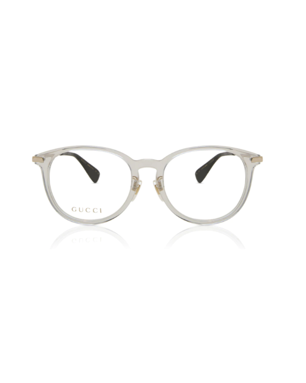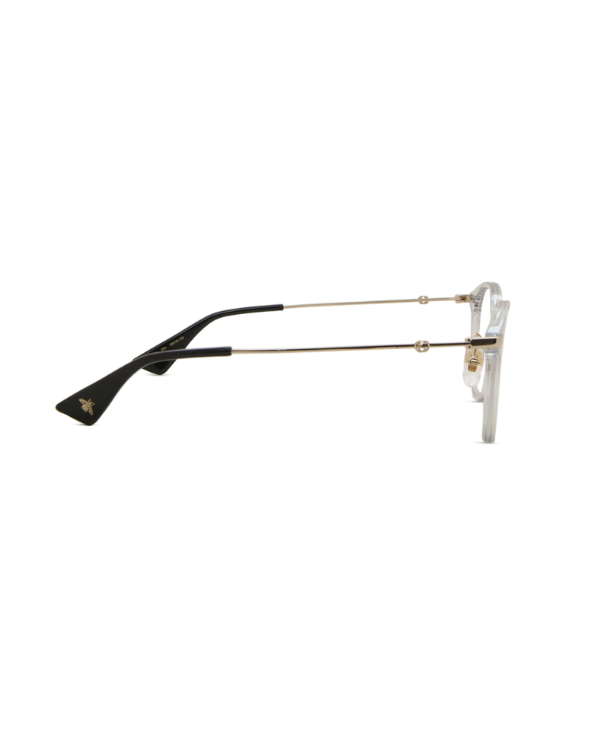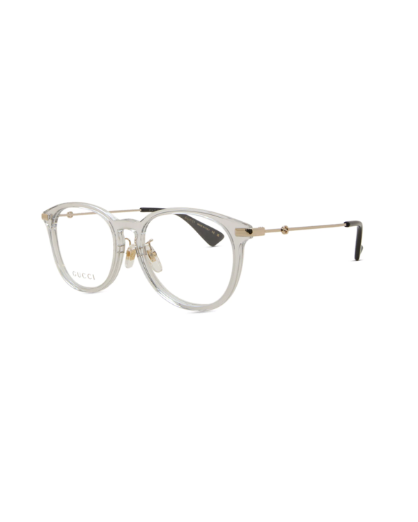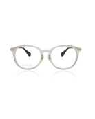 Elegant soft-round optical frame featuring Gucci’s iconic web block design. Finished in grey transparent acetate with GG interlocking logo on the temples and bee detail on the tips.