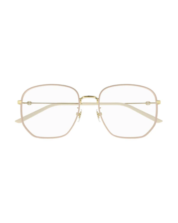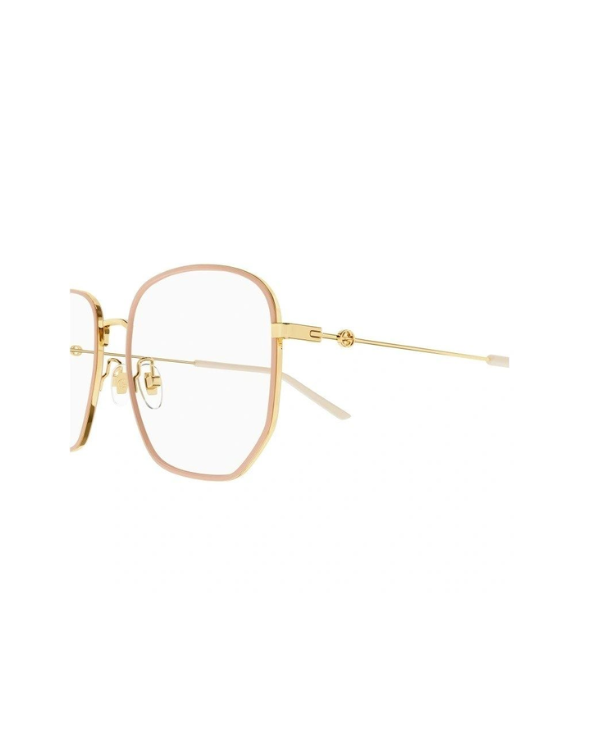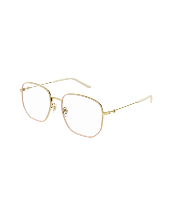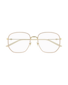 Elegant square-shaped eyeglasses combining metal construction with acetate detailing for a balanced blend of comfort and style. Finished in gold with Gucci interlocking logos on both temples.