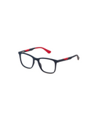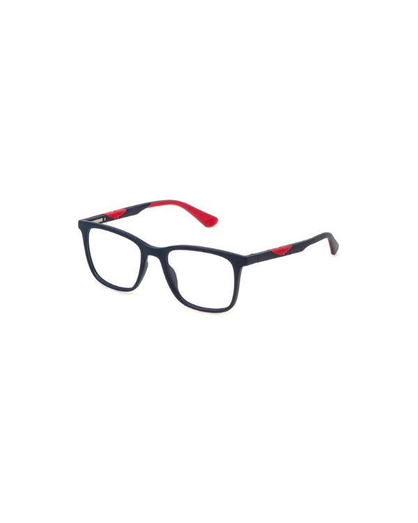 Square injected plastic eyeglasses designed for kids, featuring a transparent light blue frame. Customizable and ideal for round face shapes, part of the Police ORIGINS JR 8 collection.