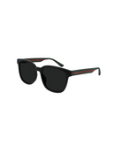 Masculine D-frame sunglasses in black acetate, featuring the iconic Sylvie stripe on the temples and Gucci logo detailing. A bold blend of heritage and contemporary style.