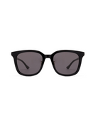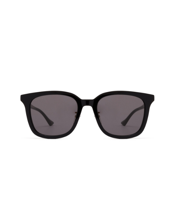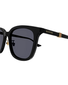 Oversized rounded design inspired by vintage archives, featuring a signature enamelled Running Web insert and lasered Gucci logo. Solid grey lenses and black frame offer timeless masculine sophistication.
