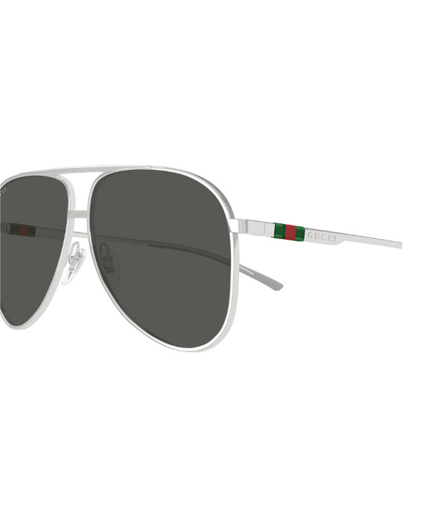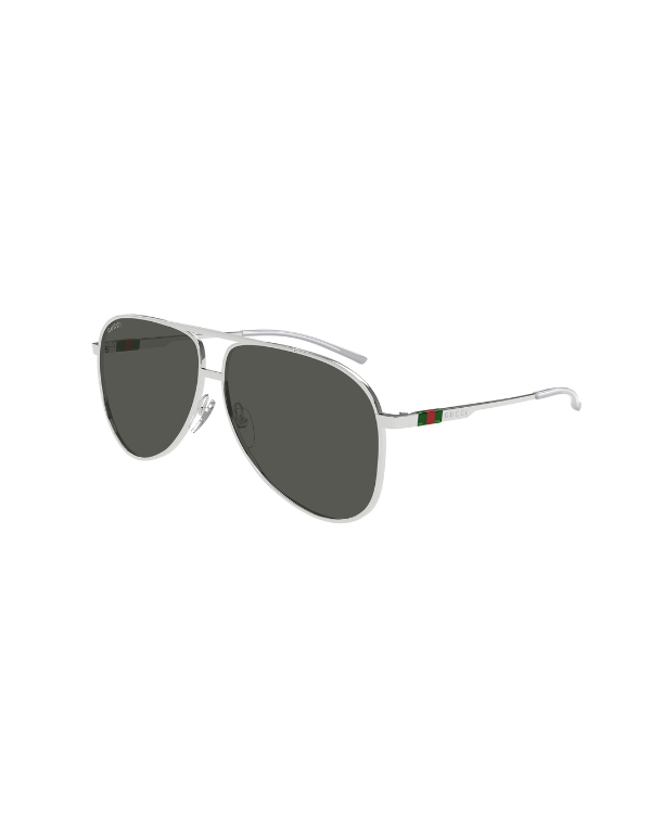 Pilot-style sunglasses crafted in silver metal, featuring injected web temple plaques and lasered Gucci logo. A refined blend of iconic branding and masculine elegance with cool grey lenses.